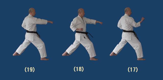 20.足はそのまま、右第二線上の方向(17.と反対方向)に振り向きながら、寄足で右第二線上に進む(前屈)と同時に、左拳中段受(甲下)右拳腰に、(17)と反対の姿勢。